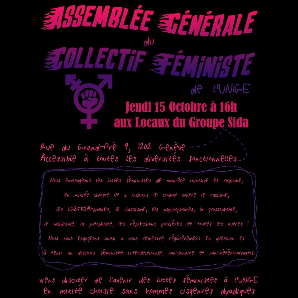 Viens discuter de l’avenir des luttes féministes à l’UNIGE lors de l’Assemblée Générale du Collectif Féministe de l’UNIGE.