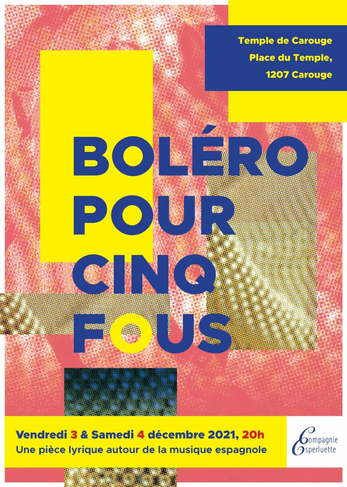 La pièce lyrique « Boléro pour cinq fous » vous propose une plongée dans la musique savante espagnole. Elle présente les amours compliquées de Catalina, une jeune marquise, et de Salvador, un peintre bohémien. Philtre d’amour rimera avec musique endiablée, peinture et paillettes !