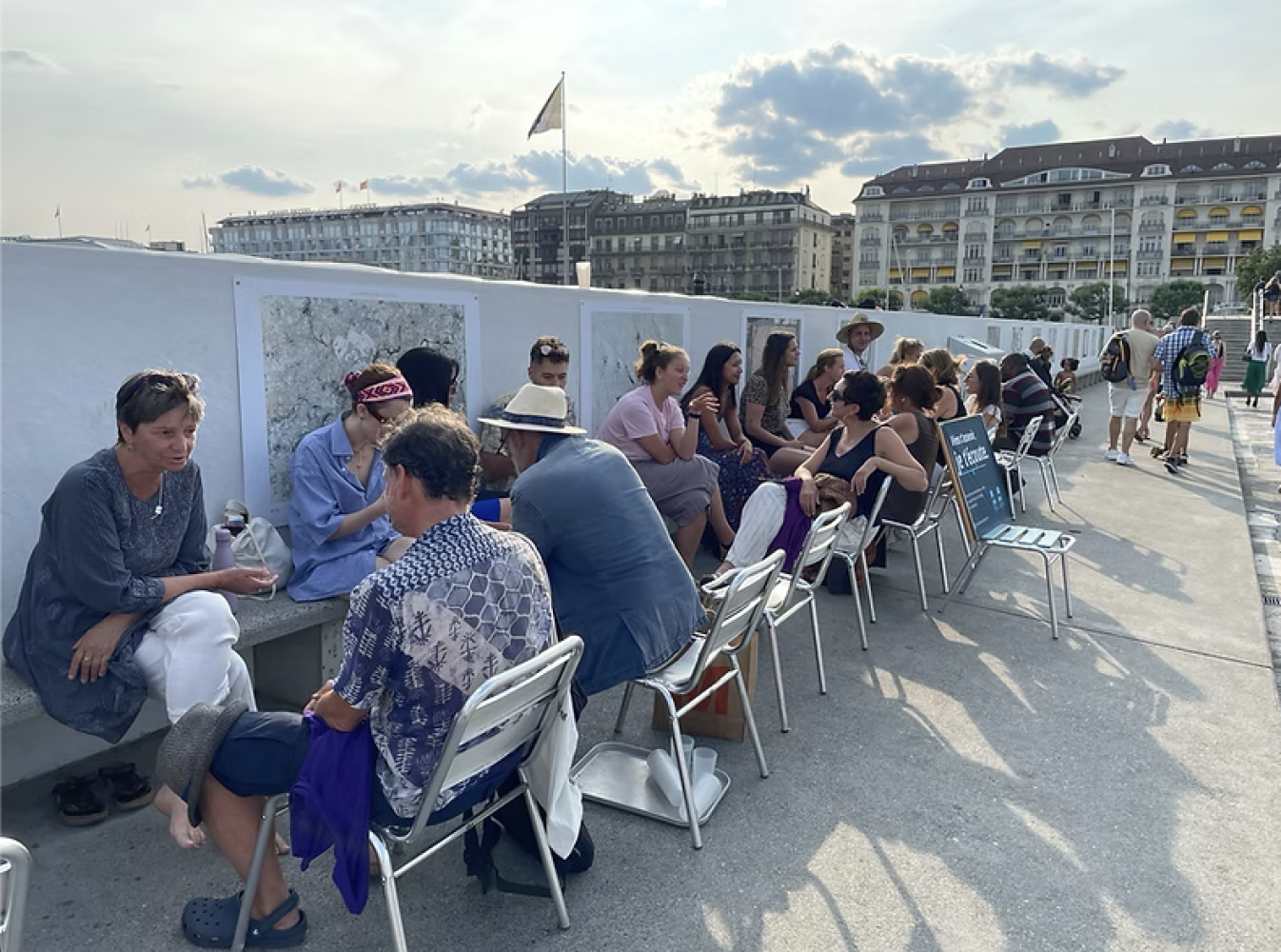 Des bénévoles s’installent sur une chaise dans la rue, au sein de l’espace public. Face à chaque bénévole, une chaise vide et une invitation aux passants-es :