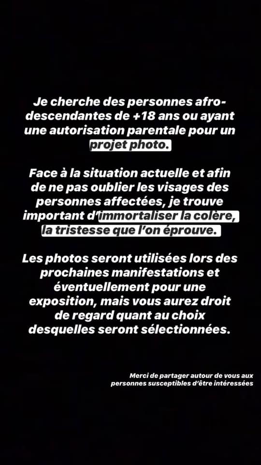 L’objectif est de mettre en avant les individus, les êtres humains, touchés par le racisme, les violences policières. Touchés par l’injustice. Le projet est mieux expliqué dans les photos qui accompagneront le post.
