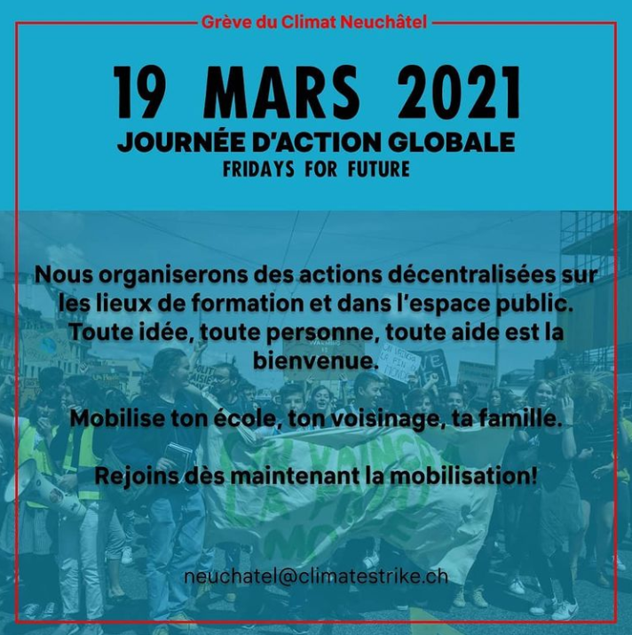 Tu peux nous contacter ici sur Insta ou par mail à l’adresse neuchatel@climatestrike.ch