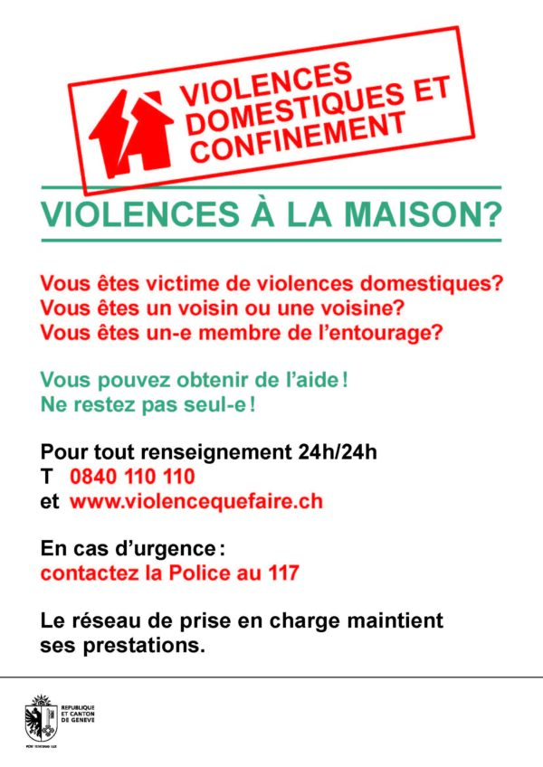 A Genève, le Conseil d’Etat n’a pas attendu : le bureau de promotion de l’égalité et de prévention des violences (BPEV) a réalisé et mis en ligne sur son site une affiche le 20 mars dernier afin de prévenir des risques de violences domestiques accentués en confinement.