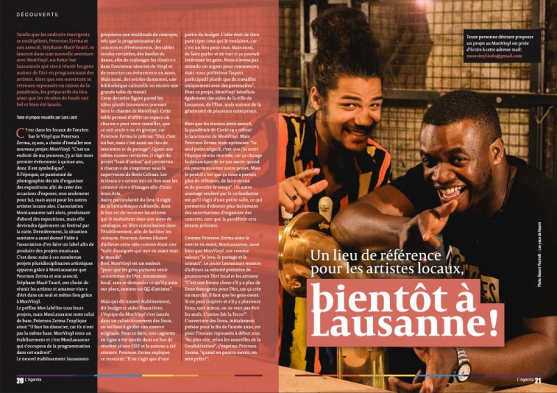 Tandis que les endroits émergents se multiplient, Peterson Zerma et son associé, Stéphane Macé-Touré, se lancent dans une nouvelle aventure avec MonVinyl, un futur bar lausannois qui vise à réunir les gens autour de l’Art en programmant des artistes. Alors que son ouverture se retrouve repoussée en raison de la pandémie, les préparatifs du lieu ainsi que les récoltes de fonds ont bel et bien été lancés.