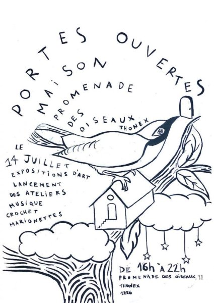 Accueil > FR > Je m’engage > Evénement > 14 Jul - 14 Jul Portes ouvertes à la Maison des Oiseaux ! Vivre ensemble Culture Event Terminé Vernissage d’artistes et lancement des ateliers d’été. 14 juillet de 16h00 à 21h30 :)