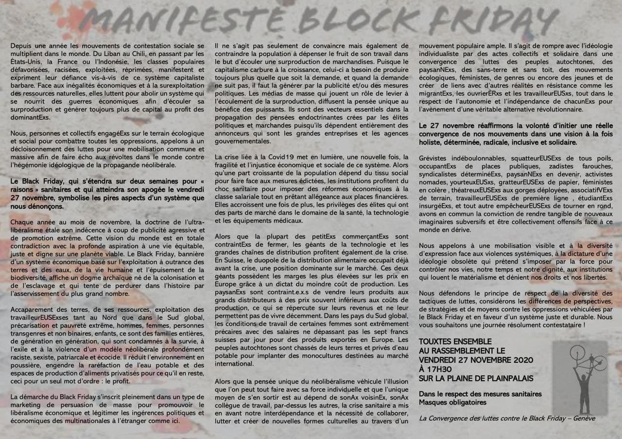 Chaque année au mois de novembre, la doctrine de l’ultra- libéralisme étale son indécence à coup de publicité agressive et de promotion extrême. Cette vision du monde est en totale contradiction avec la profonde aspiration à une vie équitable, juste et digne sur une planète viable. Le Black Friday, bannière d’un système économique basé sur l’exploitation à outrance des terres et des eaux, de la vie humaine et l’épuisement de la biodiversité, affiche un dogme archaïque né de la colonisation et de l’esclavage et qui tente de perdurer dans l’histoire par l’asservissement du plus grand nombre.