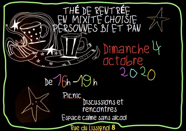 > Constament invisbilisé.e.x.s ou sujet à des remarques bi-panphobes que cela soit dans la communauté LGBTQIA+ ou par les cis-hétéras nous organisons pour la première fois un thé bi et pan en mixité choisie entre personnes bi.e.x.s / pan.x.s et/ou en questionnement le 4 octobre 2020.
